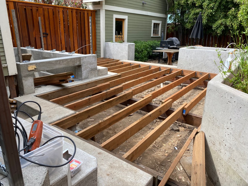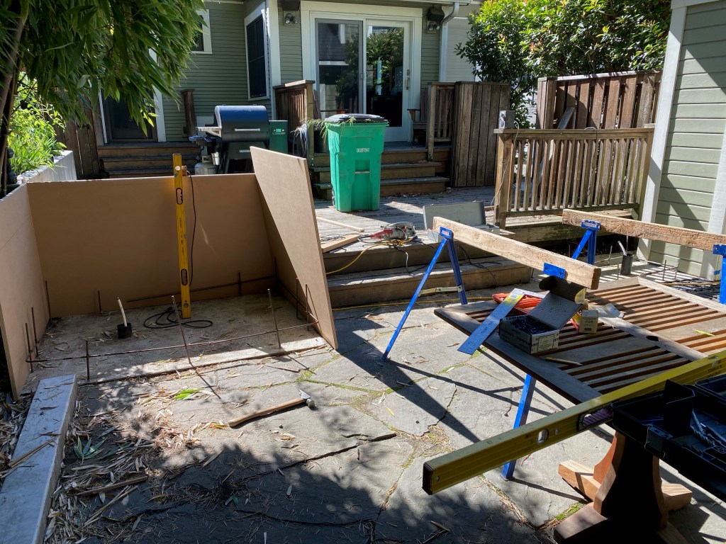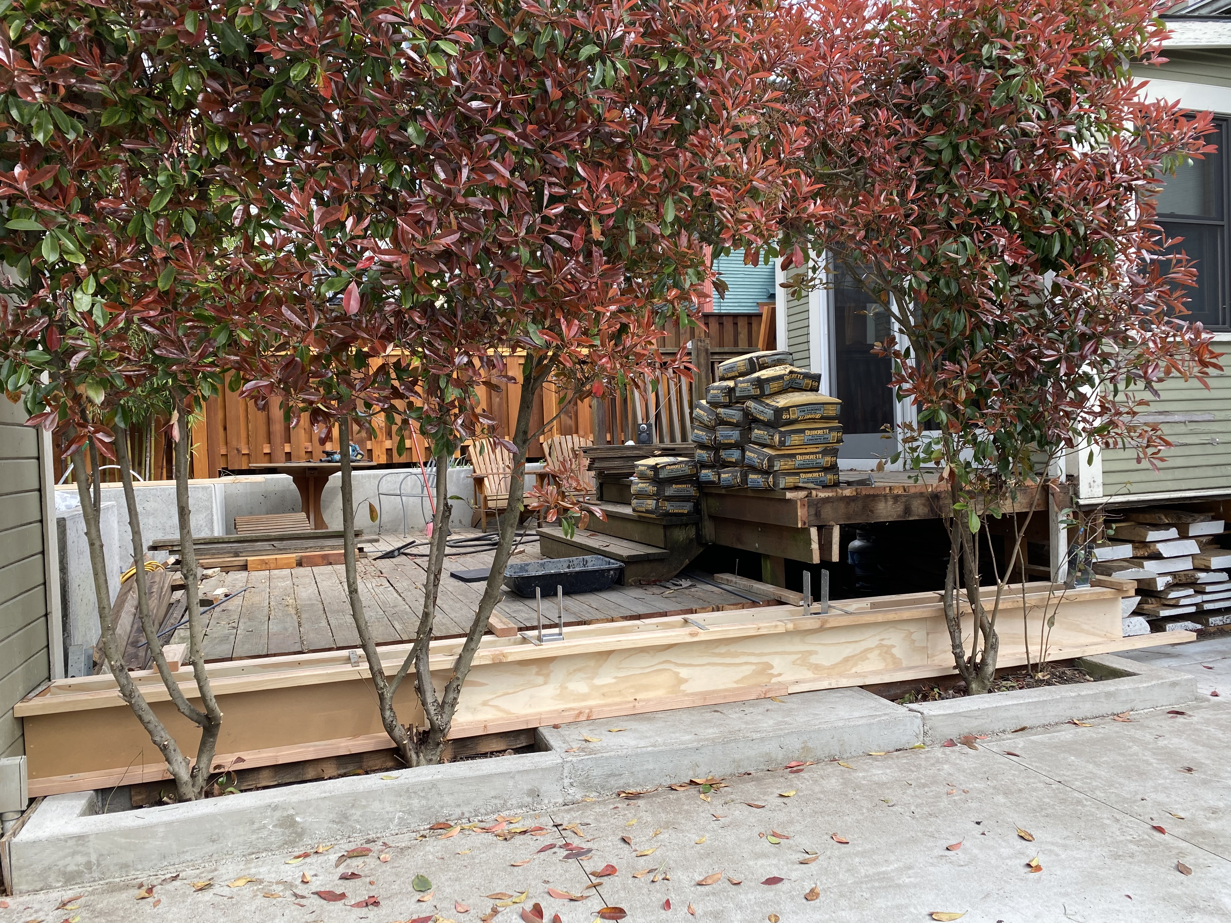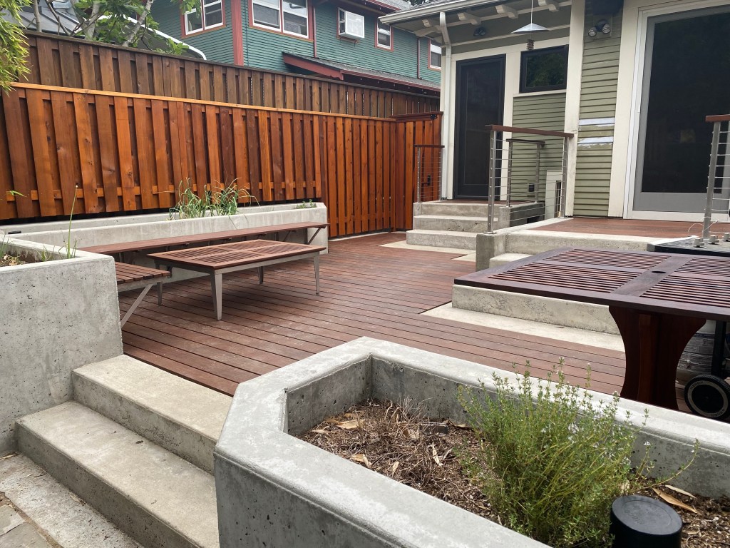 Finished Deck from Kitchen – 2021Cutting Deck for a New Concrete PlanterThe PlanFinished Planter Planter Forms with ConcreteOld Driveway and FenceForming up Base for FenceNew Steps to DeckReady to Mix ConcretePouring FootingsBack Deck in Progress – 2021Concrete Stairs in FormNew Concrete Stairs and FormDeck Framing with Beginnings of Custom HandrailsDeck FramingFinished Deck from Back Gate – 2021Making Stainless Steel BracketsStainless Steel Brackets – Almost DoneFinished Deck With Benches
