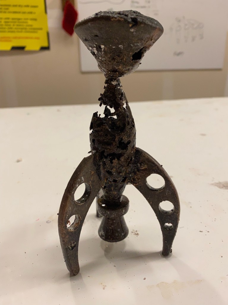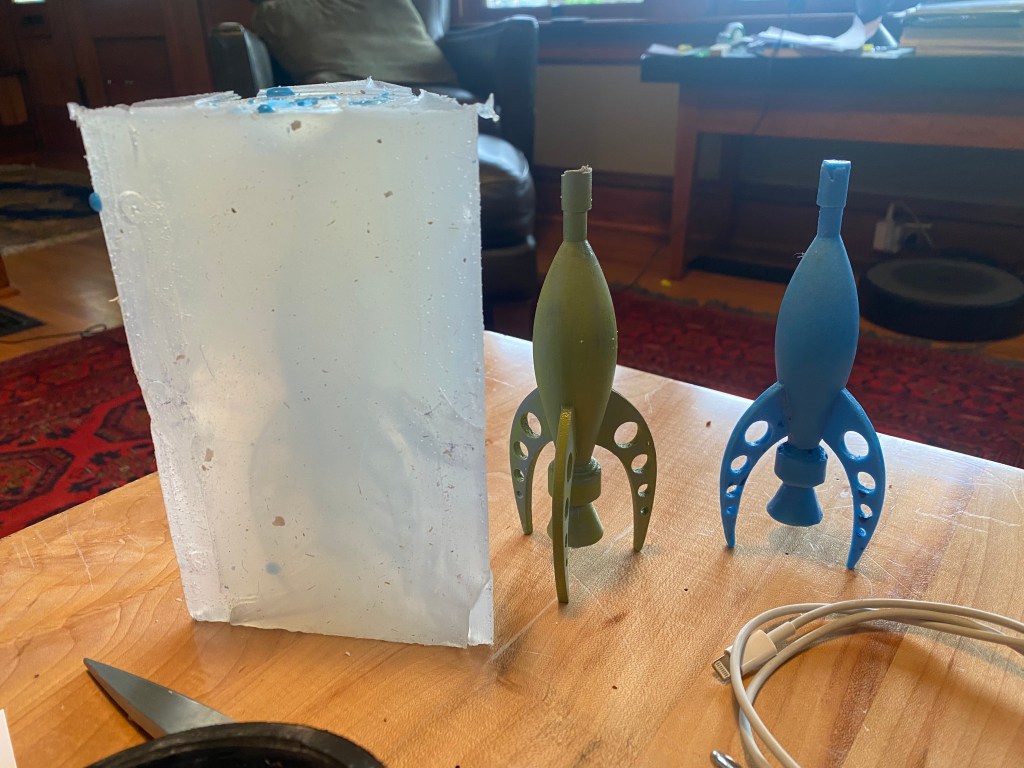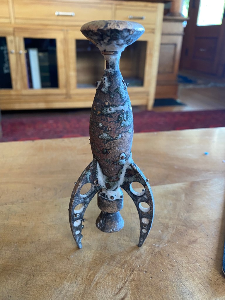 Making the ObjectMaking the MoldWax CastingOriginal and Wax CastingsHomemade Flask with Molten BronzeFailed CastingMany More Failed Castings Before Eventually Having SuccessRocket – Cast Bronze – 2021